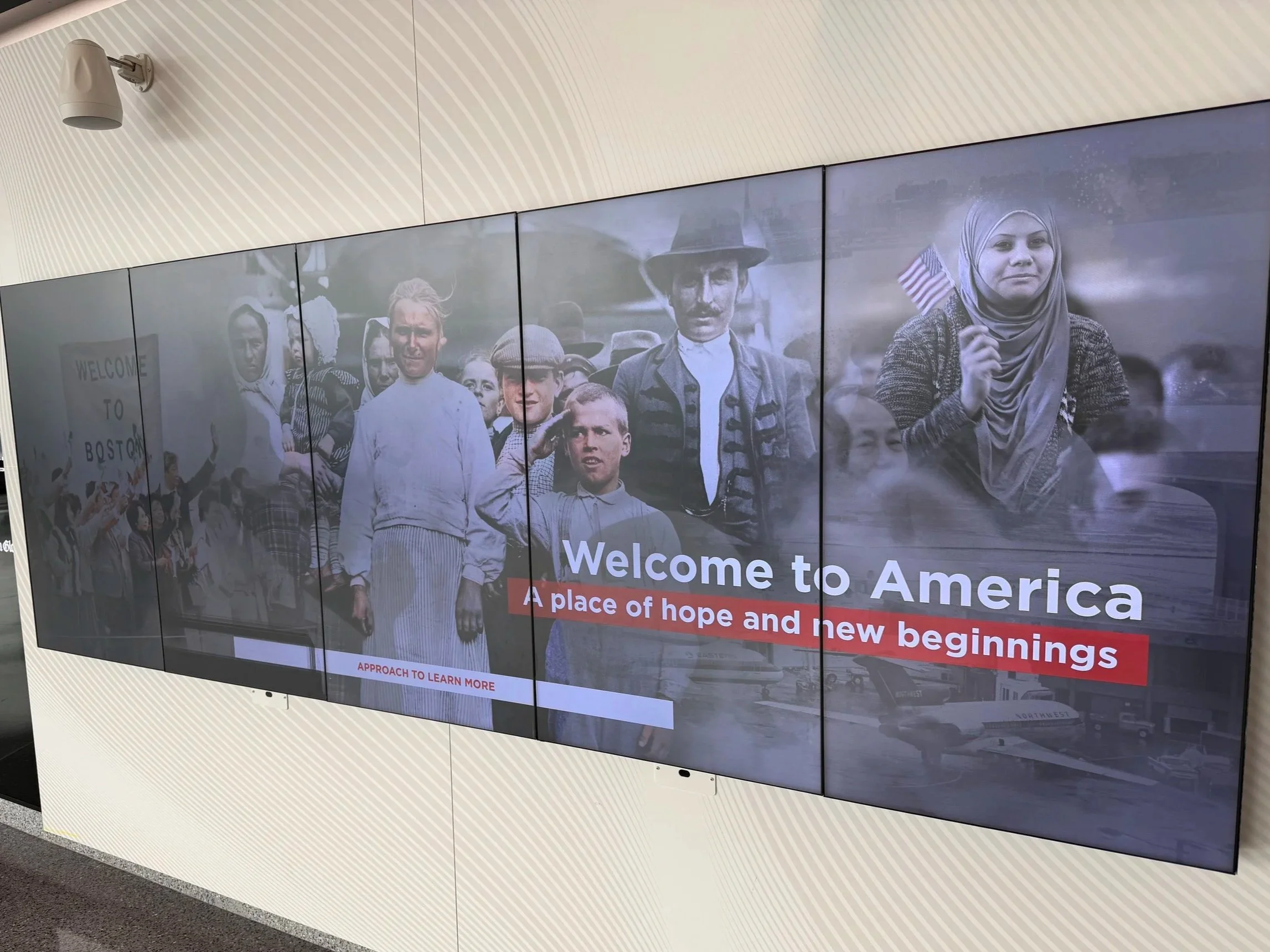 An Uber to Logan from a man from Brazil, I was not yet ready to spark my curiosity into action and ask him the obvious questions. A walk through a deserted Terminal E at Logan and two things struck me, each highlighting two distinct and counter calls to action. First, a 5-panel visual display titled “Welcome to America: A place of hope and new beginnings” with faces of immigrants from more than a hundred years ago to today. But 5 minutes later, after passing through the metal detector, a full blown message encouraging immigrants to self-deport, with an incentive of a free flight and $1,000 for EACH member of your family.” Attached were even two QR codes to get you started. I was still but managed to say to a TSA employee, “we’re living in some strange times.”