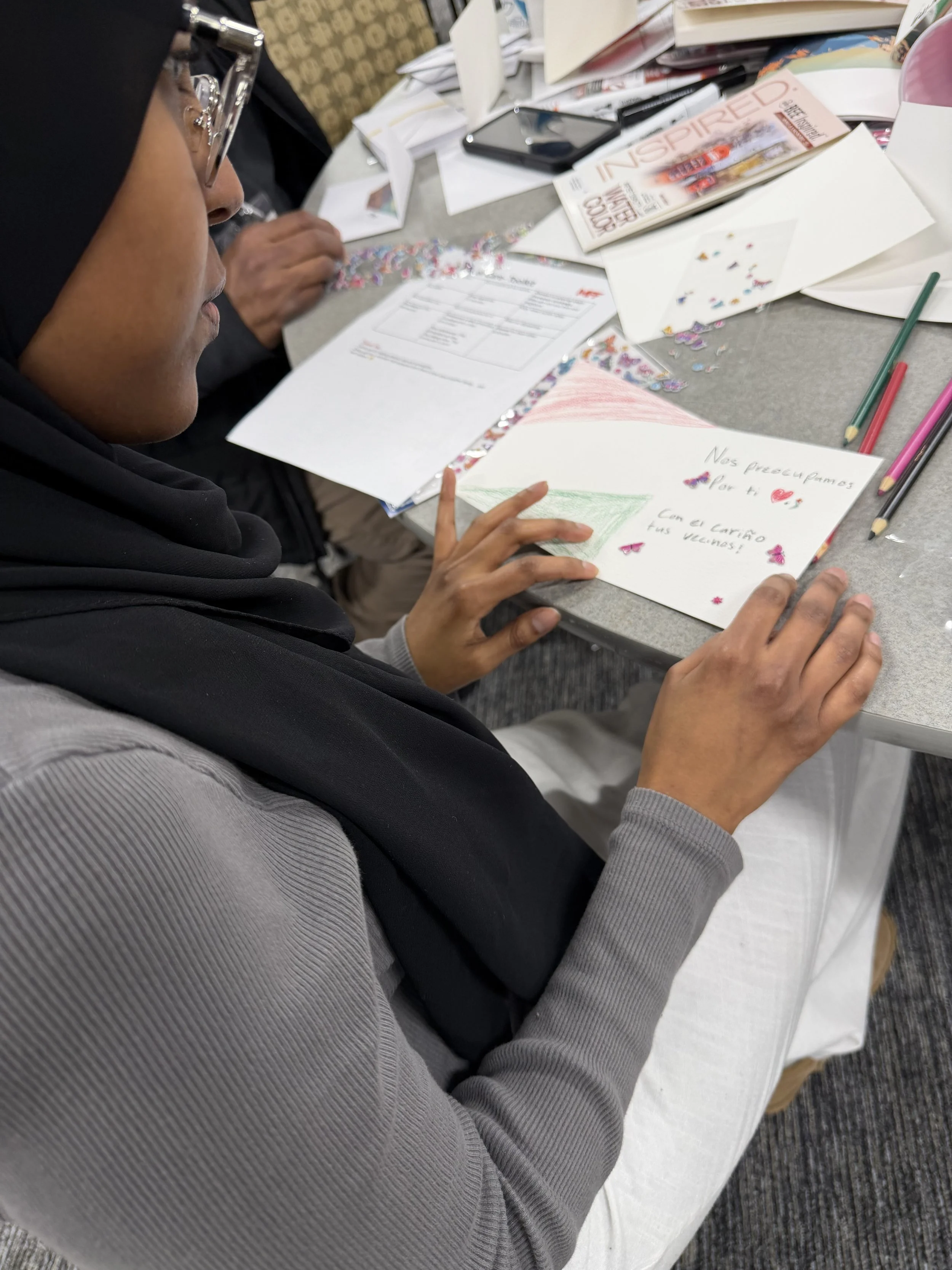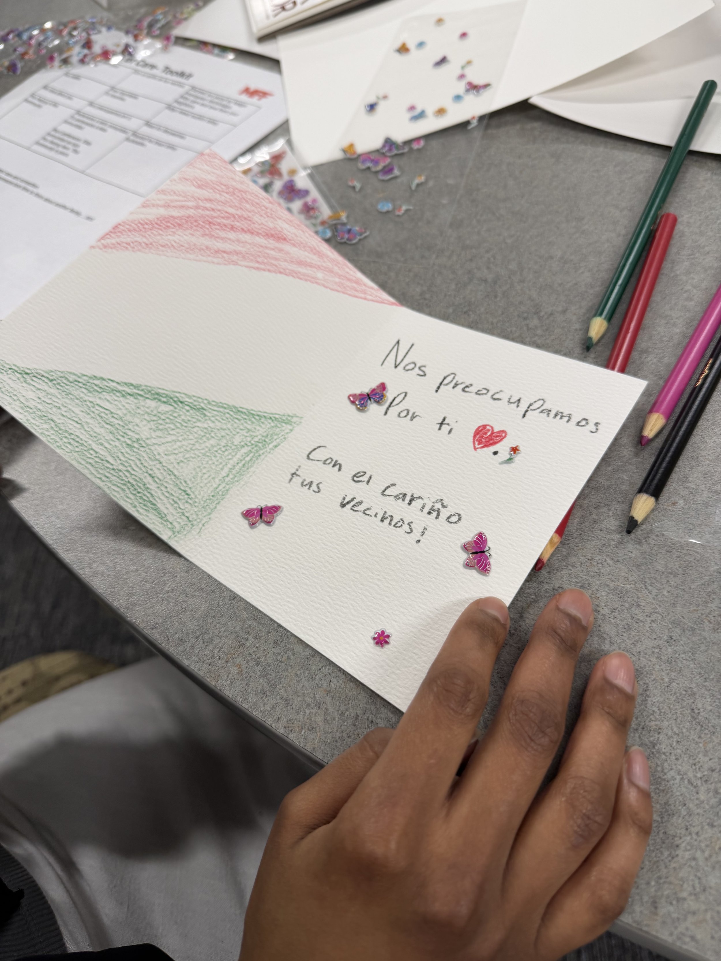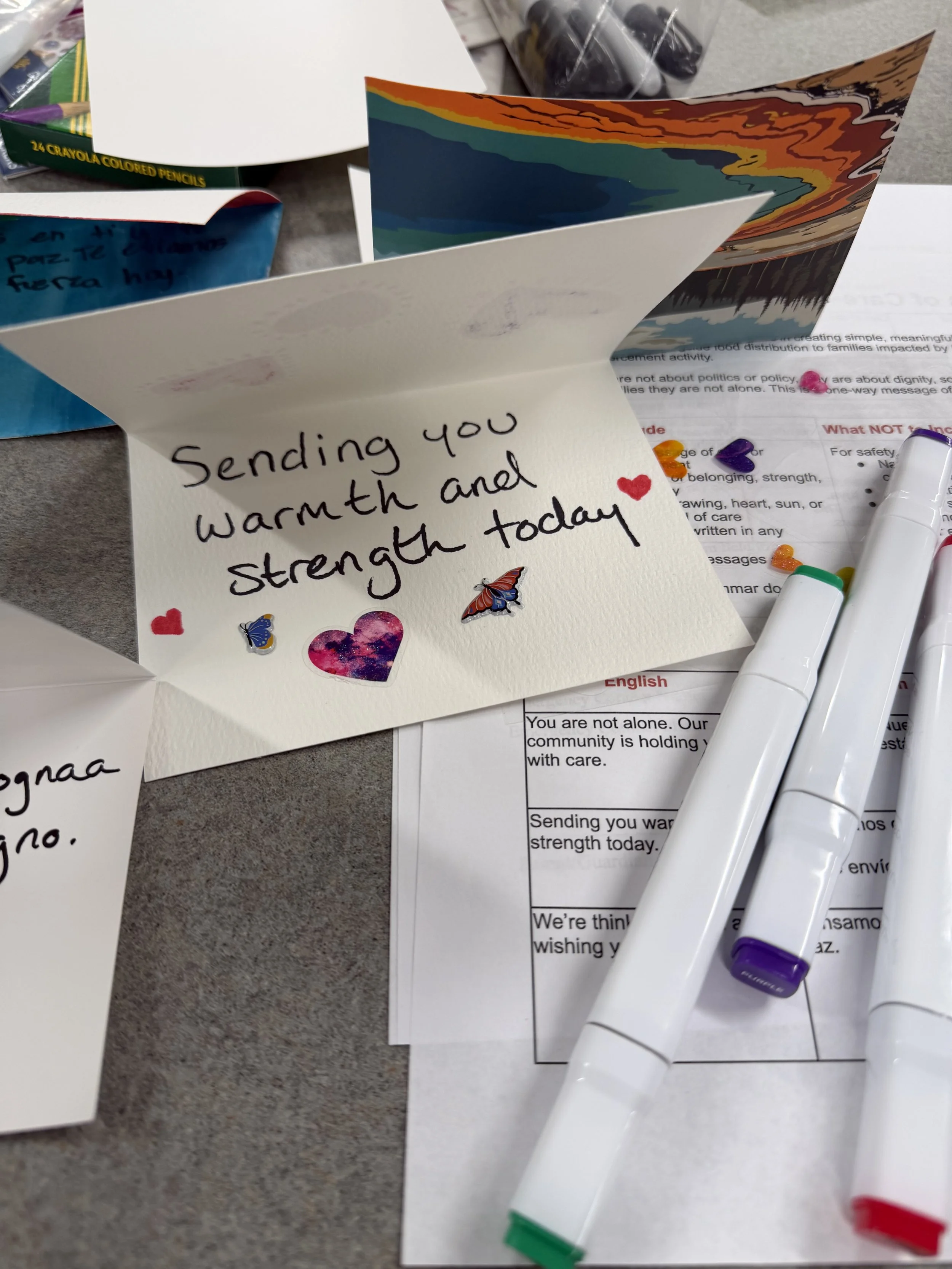 Kids from the West Side Boosters made cards of support to be included in grocery bags being delivered to immigrant families, too afraid to leave their homes.